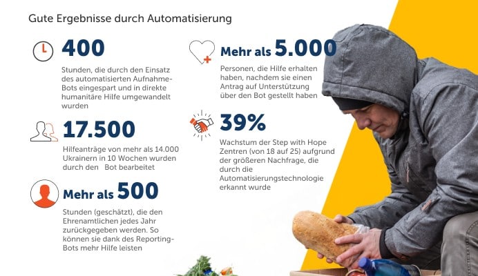 Dank Automatisierung und KI konnten in der Ukraine bis zu 400 % mehr Anträge auf humanitäre Hilfe bearbeitet werden. Dabei wurden die Prozesse verbessert, beschleunigt und skaliert, so dass die ehrenamtlichen Helfer wieder mehr Zeit für wichtige direkte Hilfeleistungen haben.